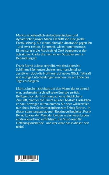 Markus ist eigentlich ein bodenständiger und dynamischer junger Mann. Da trifft ihn eine große Enttäuschung. Auf einmal sind alle Umstände gegen ihn - und zwar restlos. Es kommt, wie es kommen muss: Einweisung in die Psychiatrie! Dort begegnet er der attraktiven Carla, die nach einem Suizidversuch in Behandlung ist. Frank Bernd Lukass schreibt, wie das Leben ist: Schlimme Momente scheinen uns manchmal zu zerstören; doch die Hoffnung auf neues Glück, Tatkraft und mutige Entscheidungen machen uns am Ende des Tages zu Siegern. Markus besinnt sich bald auf den Mann, der er einmal war, und gewinnt schnell seine Energie zurück. Beflügelt von der Hoffnung auf eine glücklichere Zukunft, plant er die Flucht aus der Anstalt. Carla kann er dazu bewegen mitzukommen. Sie aber will letztlich nur eines: ihre Selbstmordpläne zum Erfolg führen... In dieser spannungsgeladenen Roadnovel begleitet Frank Bernd Lukass den Weg der beiden in ein neues Leben: eindrucksvoll und einfühlsam. Ein Must-read für Hoffnungssuchende - und wer wäre das in dieser Zeit nicht?