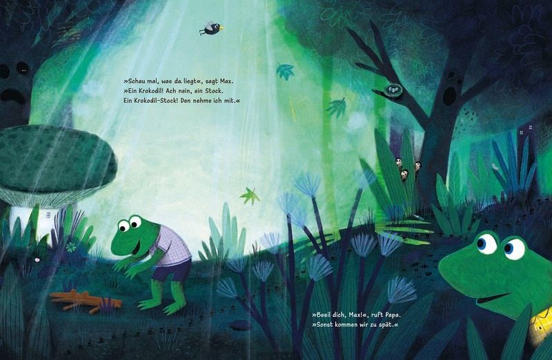 Leider passt neugierige Entdeckerlust nicht so ganz zur Eile und so werden Papa Frosch Nerven gehörig strapaziert. Der kleine Frosch schaut hier und da, entdeckt kleine Krabbelkäfer, die er beobachtet, dann gibt es eine Pfütze, in die man so schön hineinspringen kann, er findet einen Ast, der aussieht wie ein Krokodil und…. Nun ja, die Natur hat halt viel zu bieten. Die Abenteuer liegen oft in kleinen Entdeckungen am Wegesrand. Und was wir Erwachsene als Trödeln ansehen ist für die Kleinen schon eben solches.