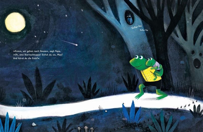 "Schlaf schön, mein Fröschlein, flüstert er, und legt seinen Arm um ihn während über ihnen die Sterne funkeln.