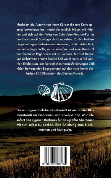 April 2022. Nach der Pandemie ist vor dem Jakobsweg. Nachdem die Autorin - im Geiste schon zigmal losgezogen - von ihrem Körper die rote Karte gezeigt bekommen hat, macht sie endlich Nägel mit Köpfen und sich auf die klassische, vielbegangene Pilgerroute von Saint-Jean-Pied-de-Port in Frankreich nach Santiago de Compostela.Aber mit 50 Jahren 800 Kilometer allein durch Spanien zu pilgern ist nicht dasselbe wie mit 23 seinen Rucksack zu schnüren. Weniger naiv, weniger mutig und weniger fit, aber mit viel Willen und einer gehörigen Portion Selbstironie hat Sandra Kerl, im Gepäck zwei Kilo bunt bemalte Pilgersteine, diese Herausforderung begonnen, persönliche Grenzen versetzt, wundervolle Menschen getroffen, und die erstaunliche Anziehungskraft des Camino Francés in all ihren Facetten erlebt.Mit viel Humor berichtet die Autorin von ihren zum Teil skurrilen Erlebnissen, den körperlichen Anstrengungen, extremen Gefühlen und dem Eintauchen in die Realität des Pilgerlebens. Mit ihrer lebendigen Erzählweise lässt sie dabei Bilder vor dem geistigen Auge entstehen als wäre man live dabei, während sie Hindernisse in Pyrenäenhöhe überwindet, Pilgersteine hinterlässt und die Schönheit der Natur und der Menschen in vielen bewegenden Begegnungen und emotionalen Momenten wahrnimmt.Dieses Buch ist: - eine persönliche Erzählung, die Sehnsüchte weckt sofort den eigenen Rucksack für das größte Abenteuer mit sich selbst zu packen. - ein einfühlsamer Reisebericht nicht nur für Pilgerfans - eine Anleitung zum Nachmachen und mutig sein - unterhaltsam, berührend und humorvoll - eine Liebeserklärung ans Pilgern