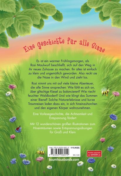 Eine Geschichte, die Achtsamkeit und Entspannung bei Kindern fördert und Stress abbautEs ist ein warmer Frühlingsmorgen, als Rosi Maulwurf beschließt, sich auf den Weg in ihr neues Zuhause zu machen. Ihr altes ist einfach zu klein und ungemütlich geworden. Also reckt sie die Nase in den Wind und zieht los.Rosi nimmt uns mit auf viele kleine Abenteuer, die alle Sinne fordern: Wie fühlt es sich an, über glitschige Kiesel zu balancieren? Wie riecht feuchter Waldboden? Und wie klingt das Summen einer Biene? Solche Naturerlebnisse und kurze Traumreisen laden dazu ein, in sich hineinzuhorchen und den eigenen Körper wahrzunehmen.Ein besonderes Buch mit vielen Extras:Die Geschichte fördert die kindliche Körper- und Sinneswahrnehmung und hilft, nach einem aufregenden Tag zur Ruhe zu kommenKurze Fantasiereisen sorgen fürs Innehalten und RunterkommenMit wunderschönen großen Illustrationen in jedem Kapitel, die zum Hineinträumen und Entdecken anregenMit Entspannungsübungen und einfachen Kinder-Yoga-Positionen am Ende des BuchesAuch für die Schule geeignet: ein Quiz bei Antolin als Extra-Motivation für Selbstleser:innen!Ein wunderschönes Geschenk für Kinder ab 5 Jahren