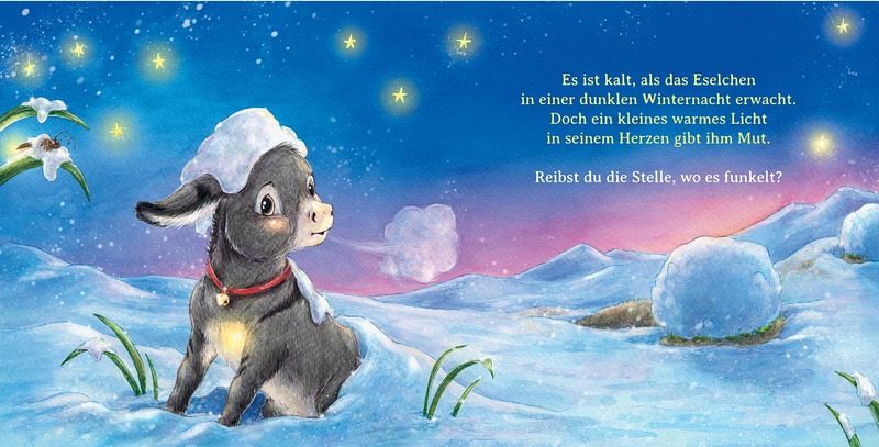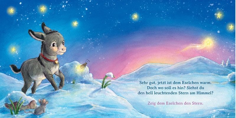 Die Weihnachtsgeschichte spielerisch, kindgerecht und ganz sanft erzähltIn einer kalten Winternacht leuchtet ein heller Stern am Himmel auf. Sieh nur, kleines Weihnachtseselchen! Dem Esel wird ganz warm ums Herz, als er den Stern entdeckt und ihr ihm gemeinsam folgt. Ermutige das Eselchen, weiterzugehen, als Wolken am Himmel aufziehen, und puste sie weg, damit der Stern wieder leuchten kann. Klopf schließlich sachte an der geheimnisvollen Stalltür an und finde zusammen mit dem Eselchen heraus, was sich dahinter verbirgt. So erlebt das Eselchen mit deiner Hilfe ein magisches Weihnachtsfest!- Bewährtes Konzept: Leicht verständliche Mitmachaktionen machen Kleinkindern ab 2 Jahren großen Spaß- Fördert Motorik und Spracherwerb: Mit sanften Interaktionen wie Pusten, Klopfen und Tippen und einfachen Texten- Tolles Weihnachtsgeschenk: Ideal als Empfehlung für Eltern und Großeltern zur Adventszeit