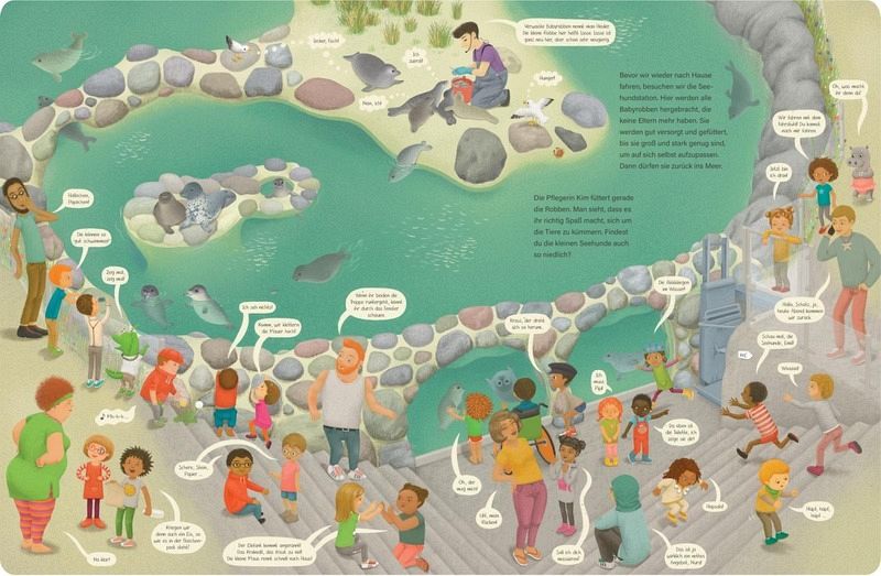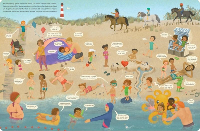 Ein Wimmelbuch, das mit seinen eingestreuten Sprechblasen große und kleine Betrachter_innen animiert, sich zu den vielen Szenen selbst zu überlegen, wer dort vielleicht gerade was sagen könnte: So geht In-Bildern-Lesen!Ein Wimmelbuch, das die Vielfalt der heutigen Gesellschaft abbildet und dadurch Identifikationsangebote schafftEin Kinderalltagsbuch, das die genaue Beobachtungsgabe und Vorstellungskraft fördertEin Bilderbuch, das unzählige Gesprächsanlässe bietetEin detailreiches und lustiges Strand-und-Meer-Erlebnis-Bilderbuch für Kinder in Kita- und VorschulalterGroßes Format - perfekt für das gemeinsame Anschauen in der Kindergruppe
