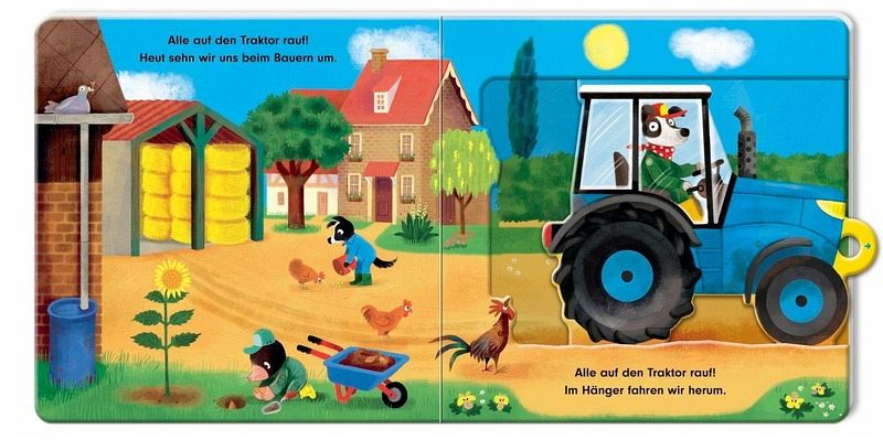 Alle auf den Traktor rauf! Heut sehn wir uns beim Bauern um! Auf dem Traktor zu fahren, macht großen Spaß! Dieses stabile Pappbilderbuch mit Schiebern und Drehrädern macht das Lieblingsthema Fahrzeuge interaktiv erlebbar. Schon kleinste Kinderhände können mithelfen, über den Bauernhof zu tuckern, die riesengroßen Räder zu drehen oder den Anhänger zu beladen.