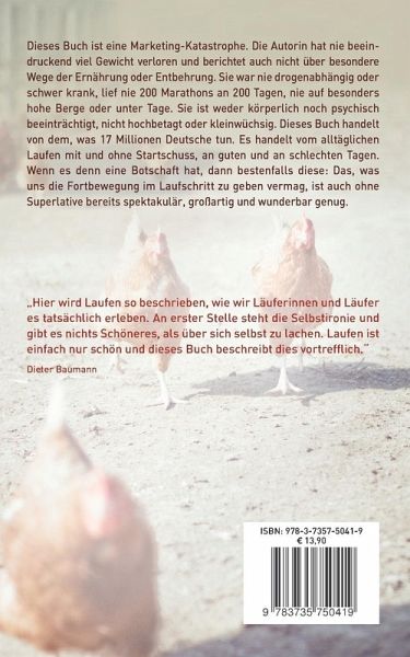 Dieses Buch ist eine Marketing-Katastrophe. Die Autorin hat nie beeindruckend viel Gewicht verloren und berichtet auch nicht über besondere Wege der Ernährung oder Entbehrung. Sie war nie drogenabhängig oder schwer krank, lief nie 200 Marathons an 200 Tagen, nie auf besonders hohe Berge oder unter Tage. Sie ist weder körperlich noch psychisch beeinträchtigt, nicht hochbetagt oder kleinwüchsig. Dieses Buch handelt von dem, was 17 Millionen Deutsche tun. Es handelt vom alltäglichen Laufen mit und ohne Startschuss, an guten und an schlechten Tagen. Wenn es denn eine Botschaft hat, dann bestenfalls diese: Das, was uns die Fortbewegung im Laufschritt zu geben vermag, ist auch ohne Superlative bereits spektakulär, großartig und wunderbar genug."Hier wird Laufen so beschrieben, wie wir Läuferinnen und Läufer es tatsächlich erleben. An erster Stelle steht die Selbstironie und gibt es nichts Schöneres, als über sich selbst zu lachen. Laufen ist einfach nur schön und dieses Buch beschreibtdies vortrefflich." Dieter Baumann
