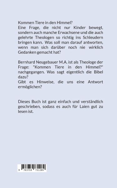 Kommen Tiere in den Himmel? - Was sagt die Bibel dazu? Eine Frage, die nicht nur Kinder bewegt, sondern auch manche Erwachsene und die auch gelehrte Theologen so richtig ins Schleudern bringen kann. Was soll man darauf antworten, wenn man sich darüber noch nie wirklich Gedanken gemacht hat? Bernhard Neugebauer M.A. ist als Theologe der Frage: "Kommen Tiere in den Himmel?" nachgegangen. Was sagt eigentlich die Bibel darüber? Gibt es Hinweise, die uns eine Antwort ermöglichen? Dieses Buch ist ganz einfach und verständlich geschrieben, sodass es auch für Laien gut zu lesen ist.