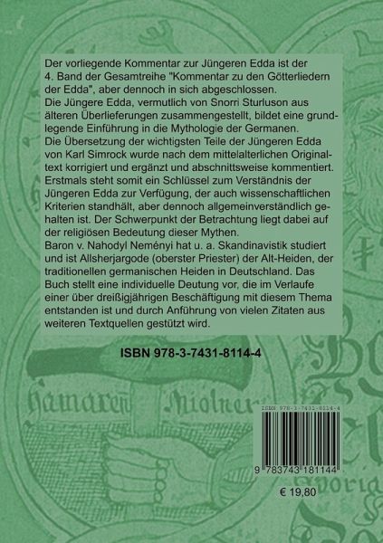 Der vorliegende Kommentar zur Jüngeren Edda ist der 4.Teil der Gesamtreihe "Kommentar zu den Götterliedern der Edda", aber dennoch in sich abgeschlossen.Die Jüngere Edda, vermutlich von Snorri Sturluson aus älteren Überlieferungen zusammengestellt, bildet eine grundlegende Einführung in die Mythologie der Germanen.Die Übersetzung der wichtigsten Teile der Jüngeren Edda von Karl Simrock wurde nach dem mittelalterlichen Originaltext korrigiert und ergänzt und abschnittsweise kommentiert. Erstmals steht somit ein Schlüssel zum Verständnis der Jüngeren Edda zur Verfügung, der auch wissenschaftlichen Kriterien standhält, aber dennoch allgemeinverständlich gehalten ist. Der Schwerpunkt der Betrachtung liegt dabei auf der religiösen Bedeutung dieser Mythen.