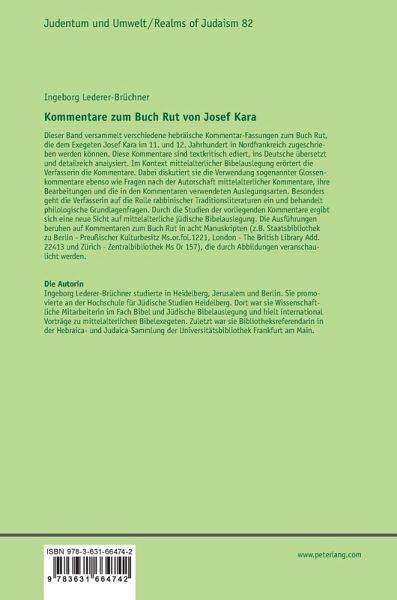 Dieser Band versammelt verschiedene hebräische Kommentarfassungen zum Buch Rut, die dem Exegeten Josef Kara im 11. und 12. Jahrhundert in Nordfrankreich zugeschrieben werden können. Diese Kommentare sind textkritisch ediert, ins Deutsche übersetzt und detailreich analysiert. Im Kontext mittelalterlicher Bibelauslegung erörtert die Verfasserin die Kommentare. Dabei diskutiert sie die Verwendung sogenannter Glossenkommentare ebenso wie Fragen nach der Autorschaft mittelalterlicher Kommentare, ihre Bearbeitungen und die in den Kommentaren verwendeten Auslegungsarten. Besonders geht die Verfasserin auf die Rolle rabbinischer Traditionsliteraturen ein und behandelt philologische Grundlagenfragen. Durch die Studien der vorliegenden Kommentare ergibt sich eine neue Sicht auf mittelalterliche jüdische Bibelauslegung. Die Ausführungen beruhen auf Kommentaren zum Buch Rut in acht Manuskripten (z.B. Staatsbibliothek zu Berlin - Preußischer Kulturbesitz Ms.or.fol.1221, London - The British Library Add. 22413 und Zürich - Zentralbibliothek Ms Or 157), die durch Abbildungen veranschaulicht werden.