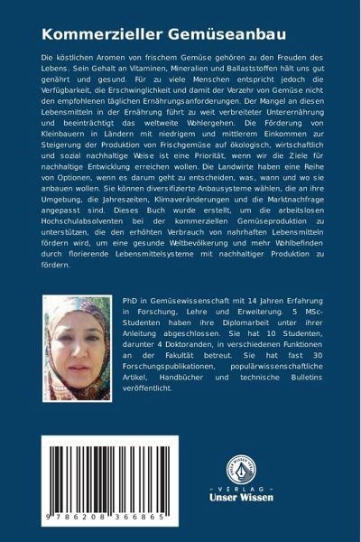 Die köstlichen Aromen von frischem Gemüse gehören zu den Freuden des Lebens. Sein Gehalt an Vitaminen, Mineralien und Ballaststoffen hält uns gut genährt und gesund. Für zu viele Menschen entspricht jedoch die Verfügbarkeit, die Erschwinglichkeit und damit der Verzehr von Gemüse nicht den empfohlenen täglichen Ernährungsanforderungen. Der Mangel an diesen Lebensmitteln in der Ernährung führt zu weit verbreiteter Unterernährung und beeinträchtigt das weltweite Wohlergehen. Die Förderung von Kleinbauern in Ländern mit niedrigem und mittlerem Einkommen zur Steigerung der Produktion von Frischgemüse auf ökologisch, wirtschaftlich und sozial nachhaltige Weise ist eine Priorität, wenn wir die Ziele für nachhaltige Entwicklung erreichen wollen. Die Landwirte haben eine Reihe von Optionen, wenn es darum geht zu entscheiden, was, wann und wo sie anbauen wollen. Sie können diversifizierte Anbausysteme wählen, die an ihre Umgebung, die Jahreszeiten, Klimaveränderungen und die Marktnachfrageangepasst sind. Dieses Buch wurde erstellt, um die arbeitslosen Hochschulabsolventen bei der kommerziellen Gemüseproduktion zu unterstützen, die den erhöhten Verbrauch von nahrhaften Lebensmitteln fördern wird, um eine gesunde Weltbevölkerung und mehr Wohlbefinden durch florierende Lebensmittelsysteme mit nachhaltiger Produktion zu fördern.