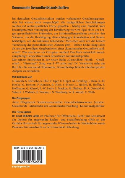 Im deutschen Gesundheitssektor werden vorhandene Gestaltungspotentiale bei weitem nicht ausgeschöpft: die maßgeblichen Entscheidungen werden auf zentralstaatlicher Ebene getroffen - häufig zum Nachteil einer bedarfsgerechten Versorgung der Bevölkerung vor Ort. Egal ob es um Fragen gesundheitlicher Prävention, um Schnittstellenprobleme zwischen den Sektoren, um die Bewältigung altersabhängiger Krankheiten und Krankheitsfolgen, um die Inklusion behinderter Menschen oder um die bessere Vernetzung der gesundheitlichen Akteure geht - letzten Endes hängt alles ab von den jeweiligen Gegebenheiten einer "kommunalen Gesundheitslandschaft". Was also muss vor Ort getan werden? Das Buch entwickelt umsetzungsfähige Perspektiven einer dezentralen Gesundheitspolitik: es beschreibt die gesundheitlichen Herausforderungen bezogen auf bestimmte Zielgruppen, bietet ein umfangreiches Arsenal von Handlungsinstrumenten, beschreibt Verantwortlichkeiten im institutionellen Gefüge staatlicher und privater Akteure und ermöglicht einen Ausblick auf die örtliche Wirtschafts- und Unternehmensentwicklung bei Ausbau einer gut funktionierenden Gesundheitsregion.