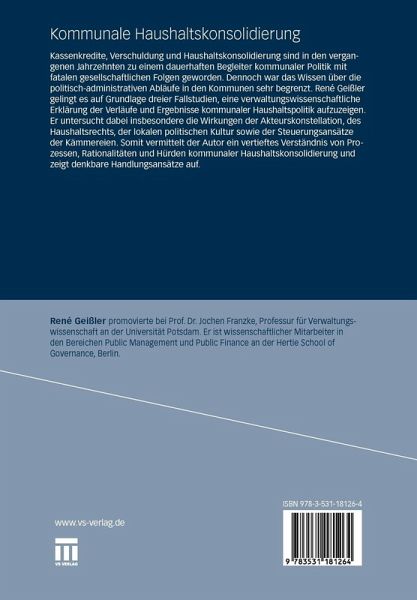 Pressestimmen: "[...] ein Werk [...], das eine verwaltungswissenschaftliche Erklärung der Verläufe und Ereignisse kommunaler Haushaltspolitik aufzeigt." Der Landkreis (Deutscher Landkreistag), 4-2013 "Das Buch gibt einen sehr detaillierten Einblick in die verschiedenen Einflussfaktoren der kommunalen Haushaltskonsolidierung." www.publicgovernance.de, 08.03.2013