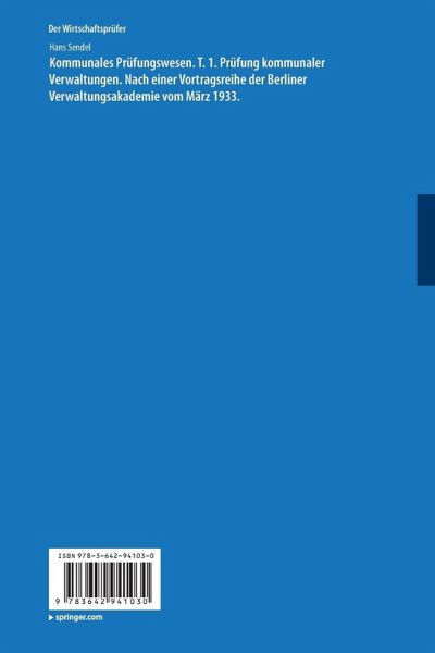 1. Revisionsrecht (Die Rechtsgrundlagen der Kämmereiprüfung).- I. Vorbemerkung.- II. Die Rahmenbestimmungen des Reichs.- III. Die landesrechtlichen Bestimmungen in Preußen.- IV. Die örtliche Rechnungsprüfung im besonderen.- V. Die Prüfung und Entlastung durch die Aufsichtsbehörde.- 2. Zusammenarbeit der örtlichen und überörtlichen Prüfungsstellen.- Abgrenzung der Arbeitsgebiete.- Vorbereitung überörlicher Prüsungen durch das örtliche Prüfungsamt: 1. Unmittelbare Verarbeitung eines Teils des Prüfungsstoffes.- 2. Mittelbare Vorbereitung durch richtige Gestaltung der Buchhaltung.- Wege zur richtigen Feststellung des Erfolgs werbender Betriebe bei kameralistischer Buchhaltung.- Schaffung der Vorausseßungen für eine richtige Vermögensrechnung.- 3. Haushaltführung und Haushaltrecht der Gemeinden und Gemeindeverbände.- I. Allgemeines.- II. Das Preußische Gemeindefinanzgesetz als Finanzgrundgeseß der Gemeinden und Gemeindeverbände.- III. Würdigung.- 4. Organisation des Kassen- und Rechnungswesens.- Ausbau und Einrichtung der Kassen.- Sicherung und Gliederung der Kassen.- Personalbeseßung.- Obliegenheiten der Kassenbeamten, Kassenanweisungen.- Zahlungsverkehr.- Registrierkassen und sonstige Hilfsmittel.- Fragen der Buchführung.- Jahresabschluß und Jahresrechnung; Behandlung der Reste.- Form und Inhalt der Rechnungsbelege.- 5. Revisionstechnik.- I. Die zur Erfüllung der Aufgaben des Prüfers erforderlichen Vorausseßungen.- II. Die Prüfung.- III. Der Prüfungsbericht.- 6. Sparsame Gemeindeverwaltung.- Vorbemerkung.- Duellen der Unsparsamkeit.- 7. Kommunale Personalwirtschaft.- I. Bedeutung und Führung der Personalwirtschaft in der Verwaltung.- II. Vorbildung, Ausbildung und Fortbildung des Verwaltungspersonals.- III. Beförderungsfragen.- IV.Begrenzung der Beamtenstellen.- V. Stellung und Rechtsverhältnisse der Angestellten; Abgrenzung gegenüber den Arbeitern.- VI. Besoldungsregeln.- VII. Behandlung der Arbeiterfragen.- 8. Beschaffung und Einkauf.- Geldliche Bedeutung der Beschaffungen im gemeindlichen Haushalt.- Beschaffungspolitik; Mengen- und Sortenbeschränkung.- Vereinheitlichung, Normung und Typisierung; technische Lieferbedingungen.- Beschaffungsverfahren; Verdingungswesen.- 9. Prüfung der Finanzverwaltung. Unter Venußung des aus der Vortragsreihe stammenden Materials redigiert.- Bedeutung der Finanzverwaltung im Rahmen der kommunalen Verwaltung.- Zwecke der Prüfung: 1. Laufende Überwachung.- 2. Prüfung der Ordnungsmäßigkeit und Zweckmäßigkeit der Vorschriften und der Organisation.- Gegenstand der Prüfung: 1. Voraussetzungen für die ordnungsmäßige Erledigung der Aufgaben der Finanzverwaltung.- 2. Geschäftsverteilung.- 3. Personalbesetzung.- Aufgabengebiete der Finanzverwaltung: 1. Erlaß der notwendigen Bestimmungen für das Haushalt-, Kassen- und Rechnungswesen.- 2. Wahl des richtigen Rechnungssystems unter Berücksichtigung der einzelnen Aufgabengebiete.- 3. Bestimmungen und Grundsätze für die Vermögensverwaltung.- 4. Betriebsmittelversorgung, Bewirtschaftung der Geldmittel und der Kapitalansammlungen.- 10. Prüfung des Wohlfahrtsamts.- I. Allgemeines.- II. Aufbau der Wohlfahrtsverwaltung.- III. Geschäftsgang.- IV. Aufbau und Aufgaben des Personalkörpers.- V. Materielle Fürsorge.- 11. Prüfung eines Krankenhauses.- I. Prüfung eines Krankenhauses hinsichtlich der Verwaltung.- II. Prüfung eines Krankenhauses hinsichtlich der Wirtschaftsführung.- III. Schlußbemerkung.