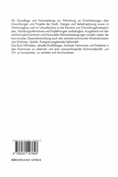 Als Grundlage und Voraussetzung zur Mitwirkung an einer Vielzahl von Entscheidungen über Entwicklungen und Projekte der Stadt-, Energie- und Verkehrsplanung sowie im Wohnungsbau und im Umweltschutz sind Entwicklungshintergründe, Handlungsalternativen und Empfehlungen unabdingbar. Ausgehend von den rechtlich-administrativen und finanziellen Rahmenbedingungen werden, über die Darstellung der kommunalen Gesamtentwicklung, drei zentrale kommunale Infrastrukturbereiche (Wohnen, Verkehr, Energie) eingehender behandelt. Das Buch hilft dabei, aktuelle Konfliktlagen, konkrete Hemmnisse und Probleme in den Kommunen zu erkennen und eine vorausschauende Kommunalpolitik "vor Ort" zu konzipieren, zu vertreten und durchzusetzen.