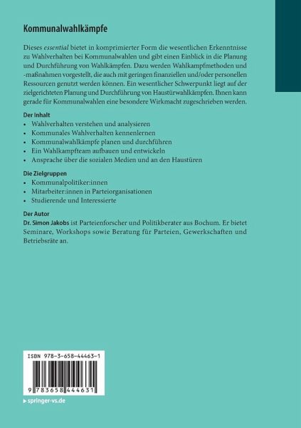 Dieses essential bietet in komprimierter Form die wesentlichen Erkenntnisse zu Wahlverhalten bei Kommunalwahlen und gibt einen Einblick in die Planung und Durchführung von Wahlkämpfen. Dazu werden Wahlkampfmethoden und -maßnahmen vorgestellt, die auch mit geringen finanziellen und/oder personellen Ressourcen genutzt werden können. Ein wesentlicher Schwerpunkt liegt auf der zielgerichteten Planung und Durchführung von Haustürwahlkämpfen. Ihnen kann gerade für Kommunalwahlen eine besondere Wirkmacht zugeschrieben werden.