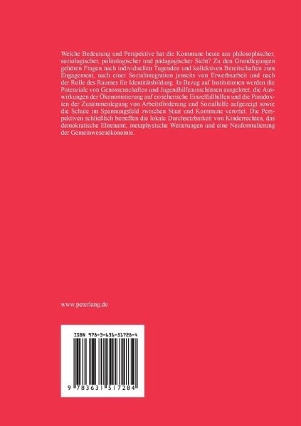 Welche Bedeutung und Perspektive hat die Kommune heute aus philosophischer, soziologischer, politologischer und pädagogischer Sicht? Zu den Grundlegungen gehören Fragen nach individuellen Tugenden und kollektiven Bereitschaften zum Engagement, nach einer Sozialintegration jenseits von Erwerbsarbeit und nach der Rolle des Raumes für Identitätsbildung. In Bezug auf Institutionen werden die Potenziale von Genossenschaften und Jugendhilfeausschüssen ausgelotet, die Auswirkungen der Ökonomisierung auf erzieherische Einzelfallhilfen und die Paradoxien der Zusammenlegung von Arbeitsförderung und Sozialhilfe aufgezeigt sowie die Schule im Spannungsfeld zwischen Staat und Kommune verortet. Die Perspektiven schließlich betreffen die lokale Durchsetzbarkeit von Kinderrechten, das demokratische Ehrenamt, metaphysische Weiterungen und eine Neuformulierung der Gemeinwesenökonomie.