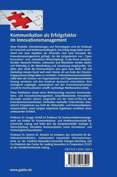 Innovation und Kommunikation als Beitrag zur Wertschöpfung.- Innovation als Treiber des Unternehmenserfolgs.- Kommunikation als konstitutives Element im Innovationsmanagement.- Kommunikation und Innovation in deutschen Unternehmen.- Open Innovation als unternehmerische Innovationsstrategie.- Open Innovation.- Wertschöpfungsprinzipien von Open Innovation.- Motivation zur Open Innovation.- Der Ideenwettbewerb als Methode der Open Innovation.- Social Software für Open Innovation.- Chancen und Risiken von Open Innovation.- Strategien und Instrumente der Innovationskommunikation.- Innovationskommunikation in den Arenen der Medien.- Strategische Kommunikation für Technologie und Innovationen.- Vertrauenskommunikation und Innovationsbarrieren.- Marktvorbereitung durch Kommunikation.- Kundenkommunikation im Zeitalter von Transparenz und Digitalisierung.- Mitarbeiterkommunikation, Change und Innovationskultur.- Kommunikation und Innovation.- Innovation und Kommunikation in der Unternehmenspraxis.- Systematische Kommunikation im Innovationsmanagement.- Integrierte Innovationskommunikation.- Innovationskommunikation mit Referenzprojekten.- Kommunikation mit Kunden im Innovationsprozess.- Innovation durch Kommunikation und Kollaboration.- Community Generated Innovation.- Web 2.0 als Innovationsplattform.- Ideenmanagement und Innovation mit Social Networks.- Interne Innovations-Community mit Bewegtbild-Formaten.- Perspektiven und Herausforderungen.- Kommunikation im Innovationsprozess.