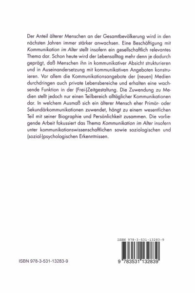 1. Einleitung.- 2. Soziologischer Problemaufriß zu Bedingungen und Dimensionen des Phänomens "Alter(n)".- 2.1 Begriffsdiskussion: Allgemeine Bemerkungen zu den Begriffen "Alter" und, "Altern".- 2.2 Altersbilder im gesellschafthchen Wandel: Historische Betrachtungen.- 2.3 Zur Altersstruktur der Bundesrepublik Deutschland.- 2.4 Bemerkungen zu Veränderungen im Bereich der Sozialkontakte im Alter.- 2.5 Zeit und Freizeit im Alter.- 3. Theorien des Alter(n)s: Soziologische und (sozial-) psychologische Erkenntnisse der gerontologischen Forschung im Überblick.- 3.1 Zur Entstehung des Defizitmodells geistiger Entwicklung.- 3.2 Sozialpsychologisch orientierte Altemstheorien.- 4. Perspektiven bisheriger kommunikationswissenschaftlicher Rezipientenforschung zur Kommunikation im Alter.- 4.1 Rezipientenforschung: Versuch einer kommunikationswissenschaftlichen Einordnung.- 4.2 Traditionen der Publikums- und Wirkungsforschung-Rubriziemngsversuche.- 4.3 Kommimikation im Alter: Sammlung und Kritik des Forschungsstandes anhand ausgewählter Studien.- 5. Kommunikation im Alter: Zur kommunikationswissenschaftlichen (Re-) Positionierung des Konzeptes Kommunikation und Persönlichkeit.- 5.1 Zur Relevanz persönlichkeits-orientierter Kommunikationsforschung.- 5.2 Rekurs: Die Erforschung von Persönlichkeitsmerkmalen in der (Massen-) Kommunikationsforschung.- 5.3 Kommunikation und Interaktion: Eine differenzierte Betrachtung.- 5.4 Kommunikation und Persönlichkeit: Eine differenzierte Betrachtung.- 5.5 Persönlichkeitsdeterminanten.- 6. Das Beziehungsgeflecht von primärer und sekundärer Kommunikation als Grundlage künftiger Forschung zur Kommunikation im Alter: Theoretische Prämissen und forschungspraktische Konsequenzen.- 6.1 Theoretische Prämissen.- 6.2 Wege zurpersönlichkeits-orientierten Fokussierung des Rezipienten: Ein Anwendungsbeispiel.- 6.3 Beiträge zur Entwicklung künftiger Forschungsvorhaben zur Kommunikation und Persönlichkeit.- 7. Fazit.- Abkürzungsverzeichnis.- Literatur.