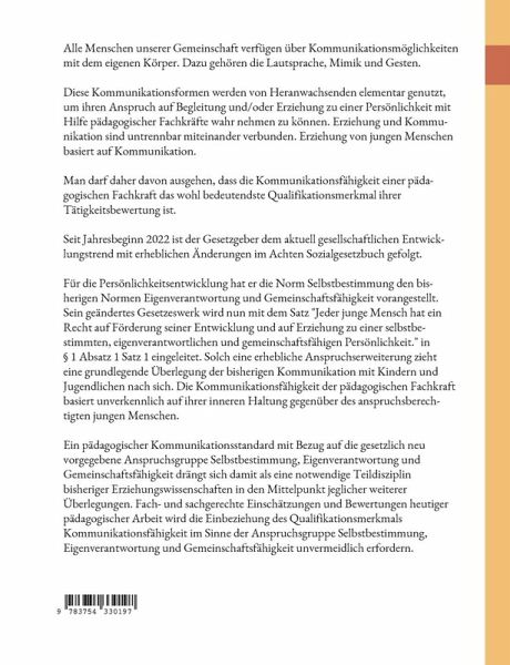 Seit Jahresbeginn 2022 hat der Gesetzgeber sehr deutlich den Anspruch junger Menschen für seine Entwicklung und Erziehung mit erheblichen Änderungen im Achten Buch -Sozialgesetzbuch- konkretisiert. Für die Persönlichkeitsentwicklung hat er nun die Norm SELBSTBESTIMMUNG den bisherigen Normen EIGENVERANTWORTUNG und GEMEINSCHAFTSFÄHIGKEIT vorangestellt. Das geänderte SGB VIII wird nun mit "Jeder junge Mensch hat ein Recht auf Förderung seiner Entwicklung und auf Erziehung zu einer selbstbestimmten, eigenverantwortlichen und gemeinschaftsfähigen Persönlichkeit." in § 1 Absatz 1 Satz 1 eingeleitet. Solch eine erhebliche Anspruchserweiterung zieht eine grundlegende Überlegung der bisherigen Kommunikation mit Kindern und Jugendlichen nach sich. Erziehung und Kommunikation sind untrennbar miteinander verbunden. Erziehung von jungen Menschen basiert elementar auf Kommunikation. Man darf daher davon ausgehen, dass die Kommunikationsfähigkeit einer pädagogischen Fach- und Lehrkraft das wohlbedeutendste Qualifikationsmerkmal ihrer Tätigkeitsbewertung ist. Wie kann ich als pädagogische Fach- und Lehrkraft diesen neuen gesetzlichen Anspruch bei meinen Schutzbefohlenen in meiner Alltagssprache fördernd so umsetzen, damit ich mich in meiner pädagogischen Arbeit nicht allzu weit weg von Recht und Gesetz bewege? Was kann ich zukünftig tun, damit ich mich im vorgegebenen Rechtsanspruch des jungen Menschen im alltäglichen Sprachgebrauch und Handeln bewege?Ein pädagogischer Kommunikationsstandard mit Bezug auf die gesetzlich neu vorgegebene Anspruchsgruppe Selbstbestimmung, Eigenverantwortung und Gemeinschaftsfähigkeit drängt sich damit als eine notwendige Teildisziplin bisheriger Erziehungswissenschaften in den Mittelpunkt jeglicher weiterer Überlegungen, weil Fach- und sachgerechte Einschätzungen und Bewertungen heutiger pädagogischer Arbeit die Einbeziehung des Qualifikationsmerkmals pädagogisch fördernder Kommunikationsfähigkeit im Sinne der neuen Anspruchsgruppennorm Selbstbestimmung, Eigenverantwortung und Gemeinschaftsfähigkeit zukünftig erfordern wird.