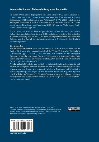 In diesem Open-Access-Tagungsband sind die besten Beiträge des 9. Jahreskolloquiums "Kommunikation in der Automation" (KommA 2018) und des 6. Jahreskolloquiums "Bildverarbeitung in der Automation" (BVAu 2018) enthalten. Die Kolloquien fanden am 20. und 21. November 2018 in der SmartFactoryOWL, einer gemeinsamen Einrichtung des Fraunhofer IOSB-INA und der Technischen Hochschule Ostwestfalen-Lippe statt.Die vorgestellten neuesten Forschungsergebnisse auf den Gebieten der industriellen Kommunikationstechnik und Bildverarbeitung erweitern den aktuellen Stand der Forschung und Technik. Die in den Beiträgen enthaltenen anschaulichen Beispiele aus dem Bereich der Automation setzen die Ergebnisse in den direkten Anwendungsbezug.