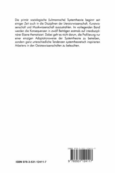 Die primär soziologische (Luhmannsche) Systemtheorie beginnt seit einiger Zeit auch in die Disziplinen der Literaturwissenschaft, Kunstwissenschaft und Musikwissenschaft auszustrahlen. In diesem Band werden die Konsequenzen in zwölf Beiträgen erstmals auf interdisziplinärer Ebene thematisiert. Dabei geht es nicht darum, die Profilierung nur einer einzigen Adaptionsweise der Systemtheorie zu betreiben, sondern ganz unterschiedliche Tendenzen systemtheoretisch inspirierten Arbeitens in den Geisteswissenschaften zu beleuchten.