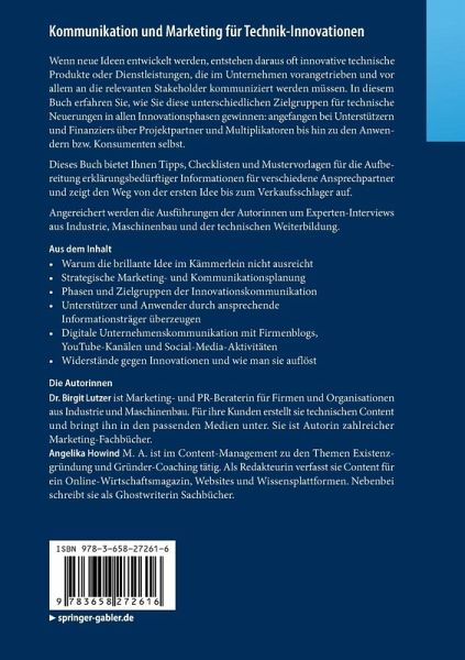 Wenn neue Ideen entwickelt werden, entstehen daraus oft innovative technische Produkte oder Dienstleistungen. Diese müssen im Unternehmen vorangetrieben und vor allem an die relevanten Stakeholder kommuniziert werden. In diesem Buch erfahren Sie, wie Sie diese unterschiedlichen Zielgruppen für technische Neuerungen in allen Innovationsphasen gewinnen: angefangen bei Unterstützern und Finanziers über Projektpartner und Multiplikatoren bis hin zu den Anwendern bzw. Konsumenten selbst. Dieses Buch bietet Ihnen Tipps, Checklisten und Mustervorlagen für die Aufbereitung erklärungsbedürftiger Informationen für verschiedene Ansprechpartner und zeigt den Weg von der ersten Idee bis zur Markteinführung auf.Angereichert werden die Ausführungen der Autorinnen um Experteninterviews aus Industrie, Maschinenbau und der technischen Weiterbildung.