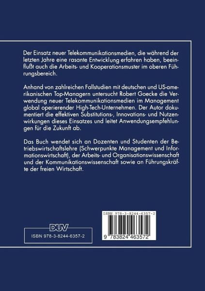 Der Einsatz neuer Telekommunikationsmedien, die während der letzten Jahre eine rasante Entwicklung erfahren haben, beeinflußt auch die Arbeits- und Kooperationsmuster im oberen Führungsbereich. Anhand von zahlreichen Fallstudien mit deutschen und US-amerikanischen Top-Managern untersucht Robert Goecke die Verwendung neuer Telekommunikationsmedien im Management global operierender High-Tech-Unternehmen. Der Autor dokumentiert die effektiven Substitutions-, Innovations- und Nutzenwirkungen dieses Einsatzes und leitet Anwendungsempfehlungen für die Zukunft ab. Das Buch wurde mit dem Alcatel-SEL Forschungspreis Technische Kommunikation 1996 ausgezeichnet.
