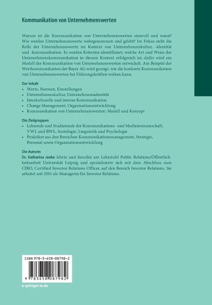 Warum ist die Kommunikation von Unternehmenswerten sinnvoll und wann? Wie werden Unternehmenswerte wahrgenommen und gelebt? Im Fokus steht die Rolle der Unternehmenswerte im Kontext von Unternehmenskultur, -identität und -kommunikation. Es werden Kriterien identifiziert, welche Art und Weise der Unternehmenskommunikation in diesem Kontext erfolgreich ist; dafür wird ein Modell der Kommunikation von Unternehmenswerten entwickelt. Am Beispiel der Wertkommunikation der Bayer AG wird gezeigt, wie die konkrete Kommunikation von Unternehmenswerten bei Führungskräften wirken kann.