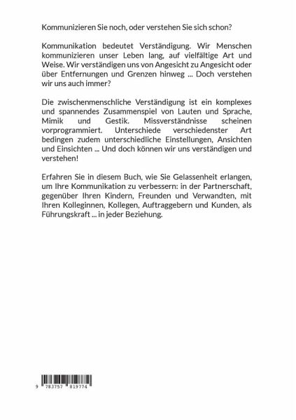 Kommunizieren Sie noch, oder verstehen Sie sich schon?Kommunikation bedeutet Verständigung. Wir Menschen kommunizieren unser Leben lang, auf vielfältige Art und Weise. Wir verständigen uns von Angesicht zu Angesicht oder über Entfernungen und Grenzen hinweg ... Doch verstehen wir uns auch immer?Die zwischenmenschliche Verständigung ist ein komplexes und spannendes Zusammenspiel von Lauten und Sprache, Mimik und Gestik. Missverständnisse scheinen vorprogrammiert. Unterschiede verschiedenster Art bedingen zudem unterschiedliche Ansichten und Einstellungen ... Und doch können wir uns verständigen und verstehen!Erfahren Sie in diesem Buch, wie Sie Gelassenheit erreichen, um Ihre Kommunikation zu verbessern: in der Partnerschaft, gegenüber Ihren Kindern, mit Ihren Auftraggebern und Kunden, als Führungskraft ... in jeder Beziehung.Ein Buch, das Sie verändern wird ...