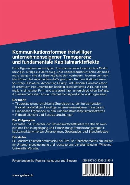 Fehlende Transparenz führt zu einer niedrigeren Bewertung und höheren Finanzierun- kosten am Kapitalmarkt. Unternehmen sind deshalb vielfach dazu übergegangen, neben der gesetzlich geforderten externen Publizität weitere Informationen zur Verfügung zu stellen. Zentrale Formen einer solchen freiwilligen Kommunikation sind zusätzliche Berichtselemente in den Geschäftsberichten (Voluntary Disclosure), der Verzicht auf eine rechtlich zulässige Bilanzpolitik (Accounting Quality) und die persönliche Kommunika- on mit institutionellen Investoren und Finanzanalysten (Personal Communication). Die vorliegende Arbeit entwickelt zunächst mit großer Sorgfalt einen eigenständigen Index zur Operationalisierung des Voluntary Disclosure. Die Accounting Quality wird modellbasiert ermittelt und ebenfalls zu einem Index verdichtet. Anschließend werden verschiedene Proxies für die persönliche Kommunikation abgewogen. Dann wird der Einfluss von Voluntary Disclosure, Accounting Quality und Personal Communication auf die Bewertung geschätzt. Soweit ersichtlich ist die vorliegende empirische Untersuchung auch international die erste, die alle drei Elemente der freiwilligen Kommunikation sim- tan betrachtet. Hierdurch gelingt es dem Verfasser, vor allem die überragende Bedeutung der persönlichen Kommunikation und das Zusammenwirken der Kommunikationsformen herauszuarbeiten. Die empirischen Ergebnisse zeigen, dass die freiwillige Kommunikation die Bewertung bzw. die Kapitalkosten signifikant beeinflussen kann. Sollten Elemente der freiwilligen Kommunikation vor diesem Hintergrund aufgegriffen und verpflichtend gemacht werden? Der Verfasser zeigt überzeugend, dass das Interesse an der freiwilligen Kommunikation in Branchen mit ausgeprägten Informationsasymmetrien besonders hochist. Wenn aber Konkurrenzeffekte drohen, kann eine freiwillige Kommunikation auch nachteilig sein. Eine Regulierung, welche Elemente der freiwilligen Publizität verpflichtend macht, ist daher abzulehnen. Die Arbeit gibt wichtige Impulse für die weitere Forschung zur freiwilligen Publizität.