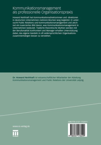Howard Nothhaft hat Kommunikationsdirektorinnen und -direktoren in deutschen Unternehmen mehrere Wochen lang begleitet. Er untersucht Public Relations und Kommunikationsmanagement und zeichnet ein nuanciertes Bild davon, was Kommunikationsmanagement in Unternehmen bedeutet. Tradierte theoretische Mythen werden mit der Berufsrealität konfrontiert und Manager erhalten Unterstützung dabei, das eigene Handeln in oft widersprüchlichen Organisationszusammenhängen besser zu verstehen.
