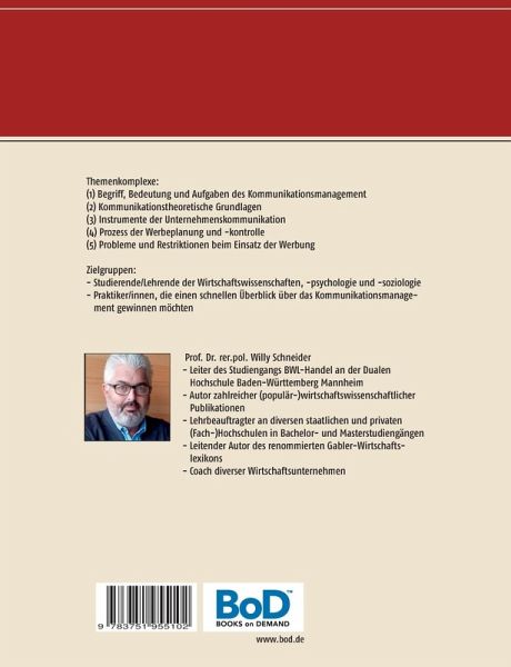 Themenkomplexe:(1) Begriff, Bedeutung und Aufgaben des Kommunikationsmanagement(2) Kommunikationstheoretische Grundlagen(3) Instrumente der Unternehmenskommunikation (4) Prozess der Werbeplanung und -kontrolle (5) Probleme und Restriktionen beim Einsatz der WerbungZielgruppen: - Studierende und Lehrende der Wirtschaftswissenschaften, -psychologie und -soziologie - Praktiker/innen, die einen schnellen Überblick über das Kommunikationsmanagement gewinnen möchten