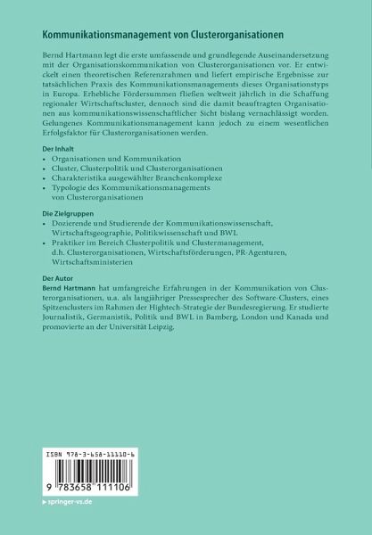 Bernd Hartmann legt die erste umfassende und grundlegende Auseinandersetzung mit der Organisationskommunikation von Clusterorganisationen vor. Er entwickelt einen theoretischen Referenzrahmen und liefert empirische Ergebnisse zur tatsächlichen Praxis des Kommunikationsmanagements dieses Organisationstyps in Europa. Erhebliche Fördersummen fließen weltweit jährlich in die Schaffung regionaler Wirtschaftscluster, dennoch sind die damit beauftragten Organisationen aus kommunikationswissenschaftlicher Sicht bislang vernachlässigt worden. Gelungenes Kommunikationsmanagement kann jedoch zu einem wesentlichen Erfolgsfaktor für Clusterorganisationen werden.