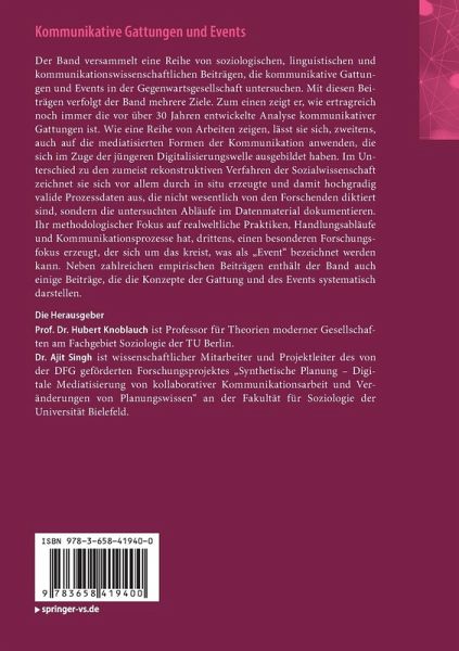 Der Band versammelt eine Reihe von soziologischen, linguistischen und kommunikationswissenschaftlichen Beiträgen, die kommunikative Gattungen und Events in der Gegenwartsgesellschaft untersuchen. Mit diesen Beiträgen verfolgt der Band mehrere Ziele. Zum einen zeigt er, wie ertragreich noch immer die vor über 30 Jahren entwickelte Analyse kommunikativer Gattungen ist. Wie eine Reihe von Arbeiten zeigen, lässt sie sich, zweitens, auch auf die mediatisierten Formen der Kommunikation anwenden, die sich im Zuge der jüngeren Digitalisierungswelle ausgebildet haben. Im Unterschied zu den zumeist rekonstruktiven Verfahren der Sozialwissenschaft zeichnet sie sich vor allem durch in situ erzeugte und damit hochgradig valide Prozessdaten aus, die nicht wesentlich von den Forschenden diktiert sind, sondern die untersuchten Abläufe im Datenmaterial dokumentieren. Ihr methodologischer Fokus auf realweltliche Praktiken, Handlungsabläufe und Kommunikationsprozesse hat, drittens, einen besonderen Forschungsfokus erzeugt, der sich um das kreist, was als "Event" bezeichnet werden kann. Neben zahlreichen empirischen Beiträgen enthält der Band auch einige Beiträge, die die Konzepte der Gattung und des Events systematisch darstellen.