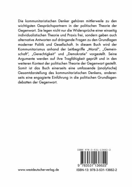 Die kommunitaristischen Denker gehören mittlerweile zu den wichtigsten Gesprächspartnern in der politischen Theorie der Gegenwart. Sie beantworten nicht nur drängende Fragen zu den Grundlagen der modernen Politik und Gesellschaft neu, sondern legen die Widersprüche einer bloß individualistischen und liberalistischen Theorie und Praxis frei. In diesem Buch wird der Kommunitarismus anhand der wichtigen Leitbegriffe "Moral", "Gemeinschaft", "Gerechtigkeit" und "Demokratie" vorgestellt, die Tragfähigkeit seiner Argumente geprüft und in den weiteren Kontext der politischen Theorie der Gegenwart gestellt. Somit ist das Buch einerseits eine umfassende (analytische) Gesamtdarstellung des Kommunitarismus, andererseits eine engagierte Einführung in die politischen Grundlagendebatten der Gegenwart.