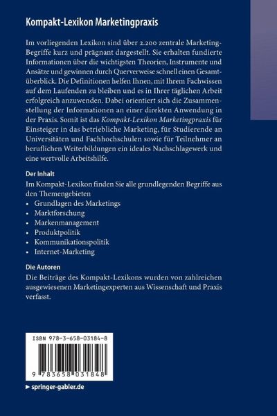 Im vorliegenden Lexikon sind über 2.200 der wichtigsten Marketing-Fachbegriffe kurz und prägnant dargestellt. Sie erhalten fundierte Informationen über die zentralen Theorien, Instrumente und Ansätze und gewinnen durch Querverweise schnell einen Gesamtüberblick. Das Lexikon richtet sich somit an Praktiker und Studierende, die ein kompaktes und praxisorientiertes Nachschlagewerk zum Thema Marketing suchen.