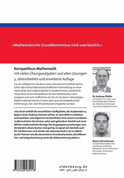 Für ein erfolgreiches Studium einer naturwissenschaftlich-technischen oder wirtschaftswissenschaftlichen Fachrichtung an einer Hochschule sind mathematische Grundkenntnisse unerlässlich. Dieses Buch ist ein Kompaktkurs für das Selbststudium zum Aneignen und zum Auffrischen der für ein Studium notwendigen Mathematik-Kenntnisse. Es kann aber auch kursbegleitend bei Einführungs-, Vor- oder Brückenkursen eingesetzt werden. Das Buch enthält die wesentlichen Stoffgebiete, die Studierende zu Beginn eines Studiums kennen sollten. Es vermittelt in einfacher, anschaulicher und allgemein verständlicher Form einen Grundstock mathematischer Kenntnisse unter weit gehendem Verzicht auf sonst übliche mathematische Strenge. Die Ausgangsvoraussetzungen zum Verständnis dieses Buches sind gering. Es eignet sich deshalb auch für Schülerinnen und Schüler der Sekundarstufe II, da im Mittelpunkt Themen wie die elementaren Grundrechenarten, die Differential- und Integralrechnung sowie die Vektorrechnung stehen.