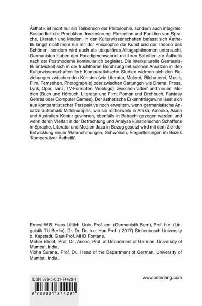 Dieses Buch zu Komparatistischen Studien im Bezirk von Ästhetik, Text- und Kulturwissenschaften widmet sich im Rahmen der interkulturellen Germanistik den Beziehungen nicht nur zwischen Literaturen, sondern auch zwischen anderen Künsten (Malerei, Bildhauerei, Musik, Film, TV) oder zwischen Gattungen (Drama, Prosa, Lyrik, Oper, Tanz, TV-Formate, Blogs), zwischen 'alten' und 'neuen' Medien (Buch/Hörbuch, Literatur/Film, Roman/Drehbuch, Fantasy Genres/Computer Games). Der ästhetische Erkenntnisgewinn lässt sich aus komparatistischer Perspektive noch erweitern, wenn germanistische Ansätze in Afrika, Amerika, Asien, Australien zur Analyse künstlerischen Schaffens in Sprache, Literatur, Medien in Bezug gesetzt werden mit dem Ziel der Entwicklung einer Pluralität von Perspektiven auf Gegenstände 'Komparativer Ästhetik(en)'.