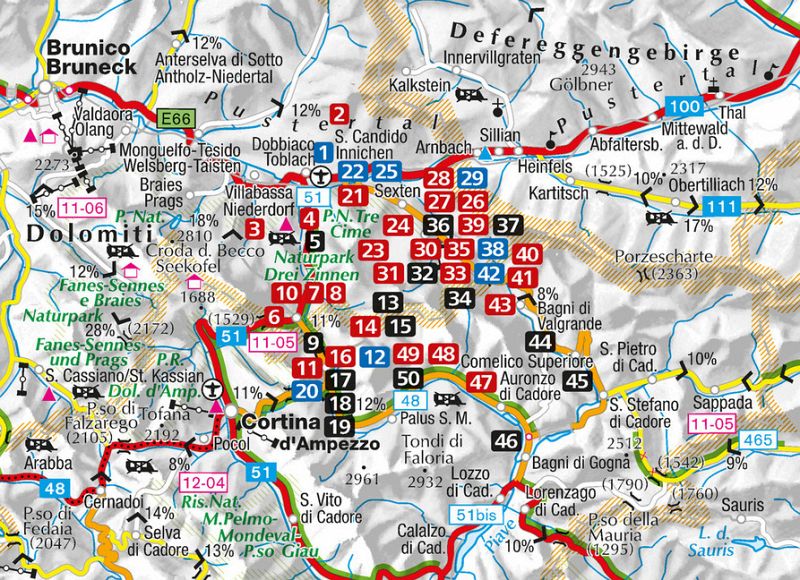 - Kaum bekannt, aber sehr interessant: die "Rückseite" der Sextener Dolomiten mit wilden Tälern und schroffen Gipfeln. Touristischer Hauptort ist Auronzo.