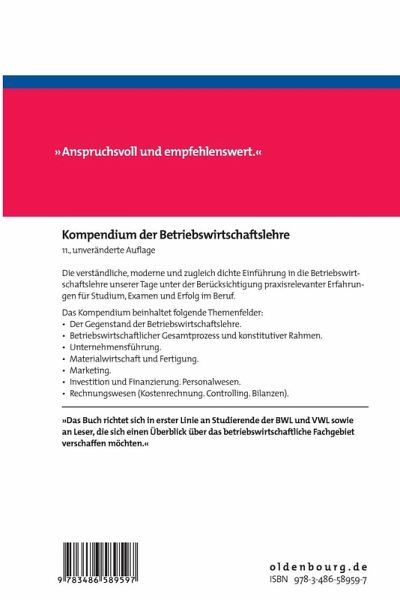 Die verständliche, moderne und zugleich dichte Einführung in die Betriebswirtschaftslehre unserer Tage unter der Berücksichtigung praxisrelevanter Erfahrungen für Studium, Examen und Erfolg im Beruf. Zum Inhalt: Der Gegenstand der Betriebswirtschaftslehre, Betriebswirtschaftlicher Gesamtprozess und konstitutiver Rahmen. Unternehmungsführung. Materialwirtschaft und Fertigung. Marketing. Investition und Finanzierung. Personalwesen. Rechnungswesen (Kostenrechnung. Controlling. Bilanzen).