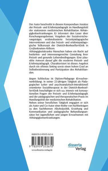Der Autor beschreibt in diesem Kompendium Ansätze der Freizeit- und Erlebnispädagogik im Handlungsfeld der medizinischen Rehabilitation Abhängigkeitserkrankungen und will damit zum besseren Verständnis der Freizeit- und Erlebnispädagogik beitragen. Er informiert den Leser über den Forschungsstand zur Freizeit- und Erlebnispädagogik und zur Evidenz dieser Ansätze, Vorgaben der Sozialversicherungsträger für die Rehabilitation sowie das freizeit- und erlebnispädagogische Teilkonzept der Dietrich-Bonhoeffer-Klinik in Großenkneten-Ahlhorn (Niedersachsen).