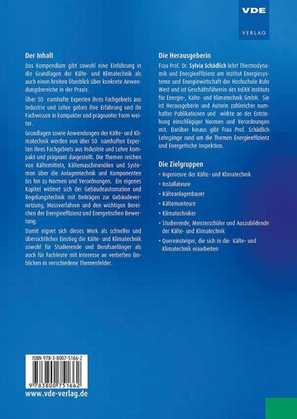 Das Kompendium gibt sowohl eine Einführung in die Grundlagen der Kälte- und Klimatechnik als auch einen breiten Überblick über konkrete Anwendungsbereiche in der Praxis.Über 50 namhafte Experten ihres Fachgebiets aus Industrie und Lehre geben ihre Erfahrung und ihr Fachwissen in kompakter und prägnanter Form weiter.Grundlagen sowie Anwendungen der Kälte- und Klimatechnik werden von über 50 namhaften Experten ihres Fachgebiets aus Industrie und Lehre kompakt und prägnant dargestellt. Die Themen reichen von Kältemitteln, Kältemaschinenölen und Systemen über die Anlagentechnik und Komponenten bis hin zu Normen und Verordnungen. Ein eigenes Kapitel widmet sich der Gebäudeautomation und Regelungstechnik mit Beiträgen zur Gebäudevernetzung, Messverfahren und den wichtigen Bereichen der Energieeffizienz und Energetischen Bewertung.Damit eignet sich dieses Werk als schneller und übersichtlicher Einstieg die Kälte- und Klimatechnik sowohl für Studierende und Berufsanfänger als auch für Fachleute mit Interesse an vertieften Einblicken in verschiedene Themenfelder.