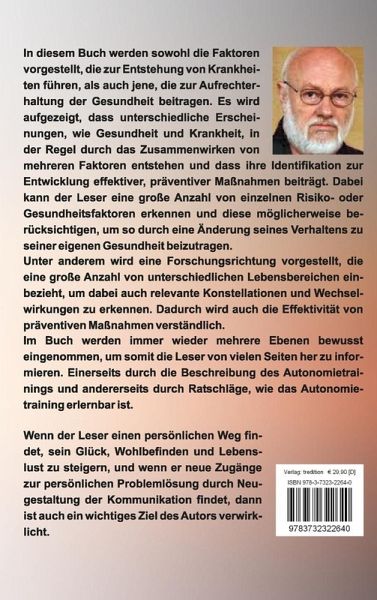 In diesem Buch werden sowohl die Faktoren vorgestellt, die zur Entstehung von Krankheiten führen, als auch jene, die zur Aufrechterhaltung der Gesundheit beitragen. Es wird aufgezeigt, dass unterschiedliche Erscheinungen, wie Gesundheit und Krankheit, in der Regel durch das Zusammenwirken von mehreren Faktoren entstehen und dass ihre Identifikation zur Entwicklung effektiver, präventiver Maßnahmen beiträgt. Dabei kann der Leser eine große Anzahl von einzelnen Risiko- oder Gesundheitsfaktoren erkennen und diese möglicherweise berücksichtigen, um so durch eine Änderung seines Verhaltens zu seiner eigenen Gesundheit beizutragen.