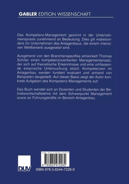 Ausgehend von den Branchenspezifika entwickelt Thomas Schiller einen kompetenzorientierten Managementansatz, der sich auf theoretische Erkenntnisse und eine umfassende empirische Untersuchung stützt. Kompetenzen im Anlagenbau werden fundiert evaluiert und anhand von Beispielen dargestellt. Auf dieser Basis zeigt der Autor konkrete Aufgaben des Kompetenz-Managements auf.