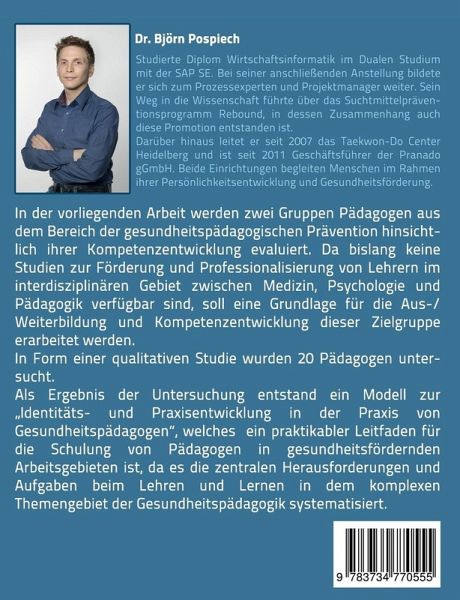 In der vorliegenden Arbeit werden zwei Gruppen Pädagogen (Suchtmittelpräventionsprogramm Rebound und Kampfkunst traditionelles Taekwon-Do) aus dem Bereich der gesundheitspädagogischen Prävention hinsichtlich ihrer Kompetenzentwicklung evaluiert. Da bislang keine Studien zur Förderung und Professionalisierung von Lehrern im interdisziplinären Gebiet zwischen Medizin, Psychologie und Pädagogik verfügbar sind, soll eine Grundlage für die Aus-/Weiterbildung und Kompetenzentwicklung dieser Zielgruppe erarbeitet werden. In Form einer qualitativen Studie wurden 20 Pädagogen untersucht. Als Ergebnis der Untersuchung entstand ein Modell zur "Identitäts- und Praxisentwicklung in der Praxis von Gesundheitspädagogen", welches ein praktikabler Leitfaden für die Schulung von Pädagogen in gesundheitsfördernden Arbeitsgebieten ist, da es die zentralen Herausforderungen und Aufgaben beim Lehren und Lernen in dem komplexen Themengebiet der Gesundheitspädagogik systematisiert.