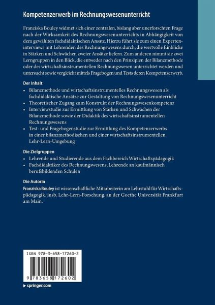 Franziska Bouley widmet sich einer zentralen, bislang aber unerforschten Frage nach der Wirksamkeit des Rechnungswesenunterrichts in Abhängigkeit von dem gewählten fachdidaktischen Ansatz. Hierzu führt sie zum einen Experteninterviews mit Lehrenden des Rechnungswesens durch, die wertvolle Einblicke in Stärken und Schwächen zweier Ansätze liefern. Zum anderen nimmt sie zwei Lerngruppen in den Blick, die entweder nach den Prinzipien der Bilanzmethode oder des wirtschaftsinstrumentellen Rechnungswesen unterrichtet werden und untersucht sowie vergleicht mittels Fragebogen und Tests deren Kompetenzerwerb.