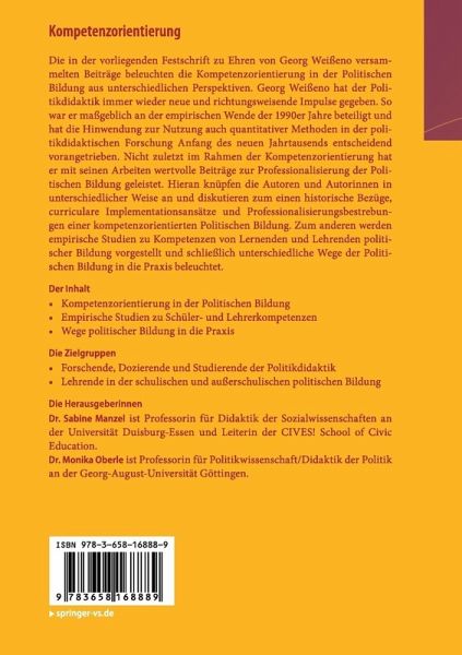 Die Bedeutung von Gefühlen für die Verinnerlichung einer demokratischen Grundhaltung.- Politische Bildung im Dienste des nationalen Wiederaufstiegs. Die staatsbürgerliche Erziehung der Studenten an der Universität Marburg während der Weimarer Republik.- Zur Implementation von Modellen politischer Bildung in die Unterrichtspraxis.- Politische Bildung im fächerübergreifenden Unterricht. Gefestigte Perspektiven und fachliche Konzepte als Grundlage.- Das Theorieproblem der Politikdidaktik.- Kompetenzorientierung und Lehrerprofessionalisierung - ein mühsames Geschäft.- Weiblich, Realschule, pädagogisches Interesse - männlich, Gymnasium, höheres Fachinteresse? Einflussfaktoren auf das Professionswissen bei angehenden Politik-Lehrkräften.- Politisches Effektivitätsgefühl von Schüler/-innen - Determinanten und Veränderbarkeit einer motivationalen Facette politischer Kompetenz.- Assoziationstest und Concept-Mapping zum Begriff Demokratie. Eine empirische Analyse zu einem Fachkonzept der Politischen Bildung.- Moral und Politik: Geschwister, die sich nicht lieben?.- Gesellschafts- und arbeitsbezogene politische Partizipationsorientierungen von Auszubildenden im Dualen System.- Probleme einer evidenzbasierten Förderung der Integration von Zuwanderern.- Fotografien in Schulbüchern deuten lernen. Ein Beitrag zur politisch-historischen Bildung in binationalen Kontexten.- Unterrichtsdokumente zur Europa-Didaktik aus der Bildungsreform um 1970.- Politische Konzepte und Narrationen in der politischen Bildung.- Politisches Interesse und Bürgerbewusstsein. Variierende Voraussetzungen Politischer Bildung.- Politische Partizipation und Bürgerbeteiligung als Kompetenzanforderung in der Landesverwaltung von Baden-Württemberg.