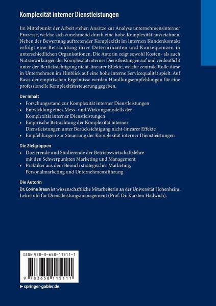 Im Mittelpunkt der Arbeit stehen Ansätze zur Analyse unternehmensinterner Prozesse, welche sich zunehmend durch eine hohe Komplexität auszeichnen. Neben der Bewertung auftretender Komplexität im internen Kundenkontakt erfolgt eine Betrachtung ihrer Determinanten und Konsequenzen in unterschiedlichen Organisationen. Die Autorin zeigt sowohl Kosten- als auch Nutzenwirkungen der Komplexität interner Dienstleistungen auf und verdeutlicht unter der Berücksichtigung nicht-linearer Effekte, welche zentrale Rolle diese in Unternehmen im Hinblick auf eine hohe interne Servicequalität spielt. Auf Basis der empirischen Ergebnisse werden Handlungsempfehlungen für eine professionelle Komplexitätssteuerung gegeben.