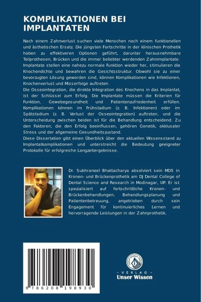 Nach einem Zahnverlust suchen viele Menschen nach einem funktionellen und ästhetischen Ersatz. Die jüngsten Fortschritte in der klinischen Prothetik haben zu effektiveren Optionen geführt, darunter herausnehmbare Teilprothesen, Brücken und die immer beliebter werdenden Zahnimplantate. Implantate stellen eine nahezu normale Funktion wieder her, stimulieren die Knochendichte und bewahren die Gesichtsstruktur. Obwohl sie zu einer bevorzugten Lösung geworden sind, können Komplikationen wie Infektionen, Knochenverlust und Misserfolge auftreten.Die Osseointegration, die direkte Integration des Knochens in das Implantat, ist der Schlüssel zum Erfolg. Die Implantate müssen die Kriterien für Funktion, Gewebegesundheit und Patientenzufriedenheit erfüllen. Komplikationen können im Frühstadium (z. B. Infektionen) oder im Spätstadium (z. B. Verlust der Osseointegration) auftreten, und die Unterscheidung zwischen beiden ist für die Behandlung entscheidend. Zu den Faktoren, die den Erfolg beeinflussen, gehören Genetik, okklusaler Stress und der allgemeine Gesundheitszustand.Diese Dissertation gibt einen Überblick über den aktuellen Wissensstand zu Implantatkomplikationen und unterstreicht die Bedeutung geeigneter Protokolle für erfolgreiche Langzeitergebnisse.