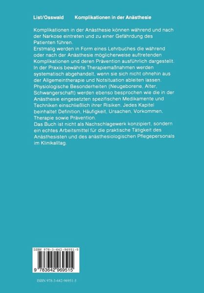 Problembeschreibung-Definition.- A: Organsysteme.- Herz-Kreislauf-System.- Respirationstrakt.- Zentralnervensystem.- Renales System.- Lebertoxizität und volatile Anästhetika.- Nausea, Erbrechen, Regurgitation und Aspiration.- Hämatologisches und hämostasiologisches System.- Endokrines System.- B: Regionale Verfahren.- Unmittelbare Reaktionen auf Lokalanästhetika.- Rückenmarknahe Leitungsanästhesien.- Brachiale Plexusblockade.- Intravenöse Regionalanästhesien (Bier-Block).- Epidurale Opiate.- C: Spezielle Techniken.- Kontrollierte Hypotension.- Monitoring.- Intubation.- Lagerungsbedingte Komplikationen.- Tourniquet.- Ventilation während der Anästhesie.- D: Physiologische Besonderheiten.- Schwangerschaft und Geburtshilfe.- Neugeborenes und Kleinkind.- Alte Patienten.- Intensivpatienten/Polytrauma.- Thrombose.- Lungenembolie.- Luftembolie.- Präoperative Eigenblutspende, Hämodilution und Autotransfusion.- E: Medikamenteninteraktionen.- Interaktionen und unerwünschte Nebenwirkungen.- Muskelrelaxantien.- Anaphylaktoide Reaktionen während der Narkose.- Flüssigkeits- und Elektrolythaushalt.- Maligne Hyperthermie.- Lachgasanwendung.- F: Postoperative Periode.- Postoperative Periode.- Arzneistoffe und Präparatebezeichnungen in Österreich, in der Schweiz und in der Bundesrepublik Deutschland.