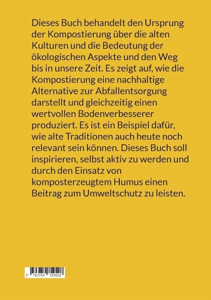 Dieses Buch behandelt den Ursprung der Kompostierung über die alten Kulturen und die Bedeutung der ökologischen Aspekte und den Weg bis in unsere Zeit. Es zeigt auf, wie die Kompostierung eine nachhaltige Alternative zur Abfallentsorgung darstellt und gleichzeitig einen wertvollen Bodenverbesserer produziert. Es ist ein Beispiel dafür, wie alte Traditionen auch heute noch relevant sein können. Dieses Buch soll inspirieren, selbst aktiv zu werden und durch den Einsatz von komposterzeugtem Humus einen Beitrag zum Umweltschutz zu leisten.